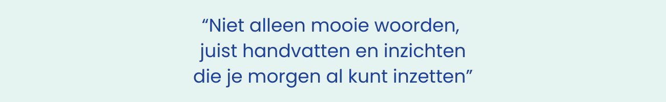Je gaat in gesprek met vakgenoten, reflecteert op je eigen organisatie en ontdekt wat er nodig is om visie écht te laten leven. Na deze sessie ga je naar huis met nieuwe inzichten, herkenbare praktijkvoorbeelden en inspiratie om direct iets in beweging te zetten.